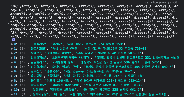 //Test code /* 1. 각 문자열을 ',' 단위로 분리시켜준다. 2. 만약 배열 안에 \r\n, 앞자리 공백, 뒷자리 공백이 있다면 제거해준다. 3. 배열이 전부 공백이라면 제외해준다. 4. 변환한 배열의 길이가 2보다 짧다면 '-'을 출력해준다. */ const testData = [ " X", " a, b, ", ", , , ,", "\r\ndet, 0, test", "abe,d, e", "asdfae,sefas, efasef", " 고봉삼계탕,삼계탕,서울 강남구 봉은사로 524 삼성동 159 ", ]; testRemoveNull(testData); function testRemoveNull(rows) { const data = []; for (let i = 0; i < rows.length; i++) { let tempArr = rows[i] // .split(/[\,/\r\n]+/) .map((row) => row.replace(/^[\s]+|[\s]+$/, "")) .filter((e) => e === 0 || e); if (tempArr.length !== 0) { if (tempArr.length === 3) { data.push(tempArr); continue; } else { const len = tempArr.length; for (let j = len; j < 3; j++) { tempArr.push("-"); } data.push(tempArr); } } } console.log(data); }만약 CSV파일 속 자료가 이상한 경우 데이터 값이 이상하게 출력될 수 있으므로,