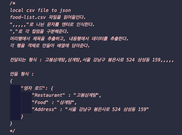 웹에 있는 CSV to JSON 기능을 사용할까 하다가, 직접 변환 알고리즘을 제작해보기로 마음먹었다.
