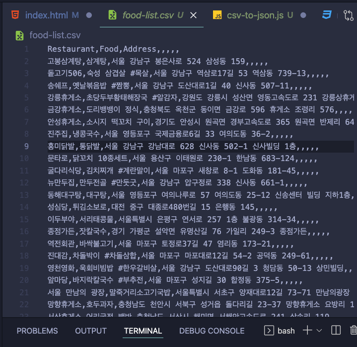 인터넷에 검색해보면 엑셀로 정리된 맛집 리스트가 많은데 그 중 데이터가 대략 70개 정도 되는 "영자로드 맛집 파일"을 사용하기로 했다.